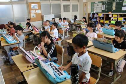 国語の時間には、学習用タブレットのアプリでひらがなカタカナの練習をしました。音楽の時間には、鍵盤ハーモニカで「なかよし」を演奏しました。道徳の時間には、国や言葉が違ってもあいさつすることの大切さを感じました。