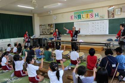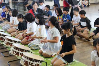 お囃子の保存会の方を講師に迎え、地域の伝統芸能である「チャラボコ」の演奏を体験しました。
