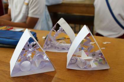 書写の時間には、書き順に気を付けながら「成長」を書きました。外国語の時間には、歌やチャンツをしながら「Who is this?」の表現の練習をしました。図工の時間には、ペーパーアートトライアングルの作品作りをしました。