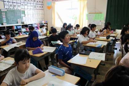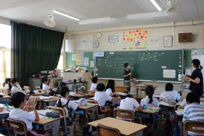 算数の時間には、かさの学習の復習をしました。図工の時間には、夏の思い出の絵に色を塗りました。国語の時間には、学習発表会の招待状の下書きをしました。