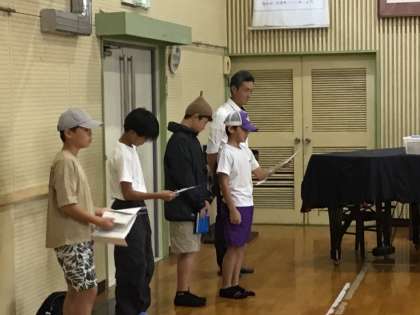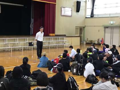 体育館で出発式を行いました。いよいよ旅のスタートです。日本の歴史と未来を学ぶ旅になると良いです。