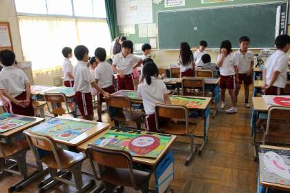 図工の時間には、お話の絵の鑑賞会をしました。友達の作品の良いところをたくさん見つけました。