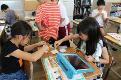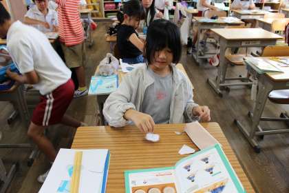 算数の時間には、画用紙を使っていろいろな形のコマづくりをしました。バランスよく回るよう工夫しました。