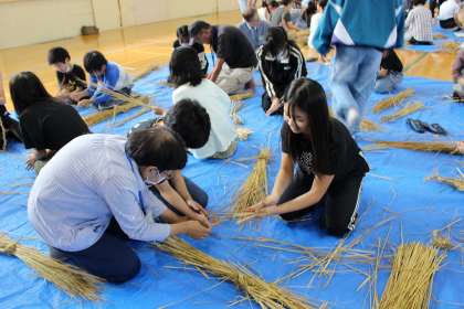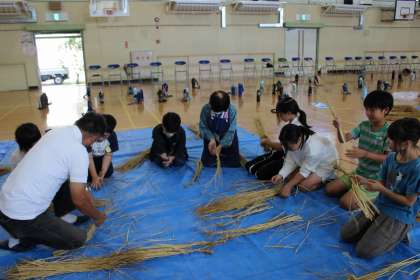 さわやかクラブの皆さんに、すがい縄づくりを教えていただきました。来週の稲刈りのときに、刈った稲をすがい縄で縛ります。