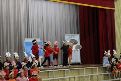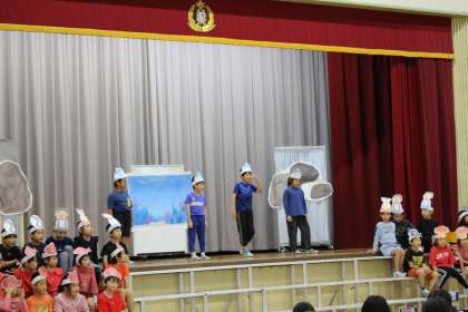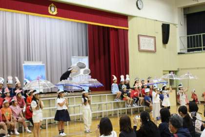 第1部はスイミーの劇をしました。赤い魚がまぐろに食べられてしまします。スイミーは仲間を探して海を泳ぎ、クラゲに出会います。