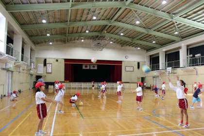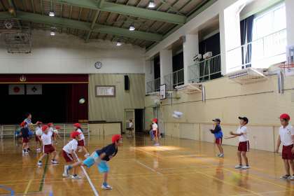 国語の時間には、物語「ニャーゴ」をみんなで読みました。体育の時間には、ボール投げの練習をしました。