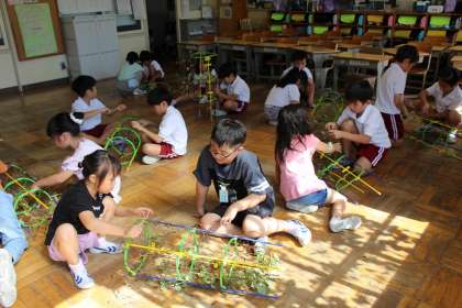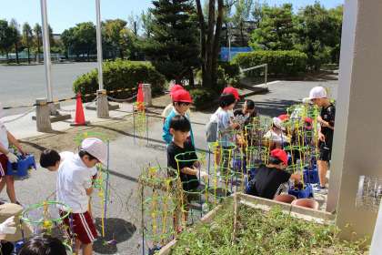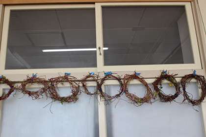 生活科の時間には、アサガオのつるを使ってリースづくりをしました。