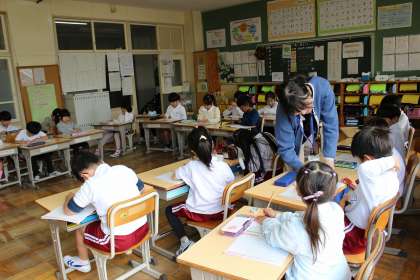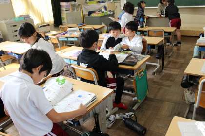 生活科の時間には、好きな虫の特徴や食べ物、住みかなどについて図鑑や本で調べてました。算数の時間には、いろいろな形の箱を使って、積んだり並べたりして形遊びをしました。道徳の時間には、命の誕生の尊さを感じました。