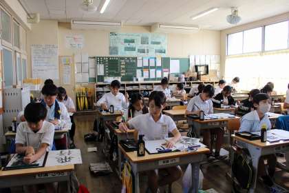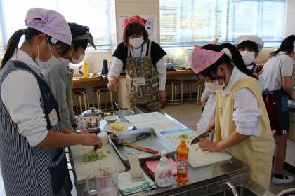 5年1組が家庭科の時間に、ご飯とみそ汁を作りました。算数の時間には、分母の違う分数の大きさを比べる方法を考えました。書写では、文字の大きさと配置に気を付けながら「飛行」を書きました。