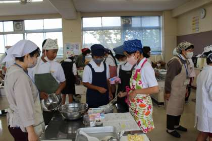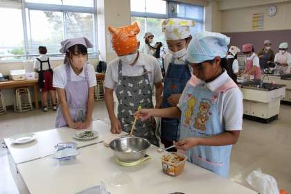 家庭科の時間には、ボランティアの方に支援していただきながら、5年2組が調理実習をしました。ご飯を鍋で炊き、みそ汁を作りました。