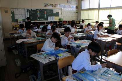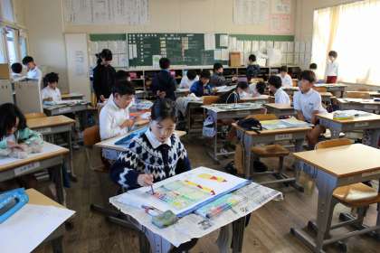 図工の時間には、読書感想画「手袋を買いに」の色塗りをしました。