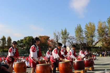 若東スポーツフェスタの開会式で、和太鼓クラブが演奏を披露しました。全校のみんなにエールを送りました。
