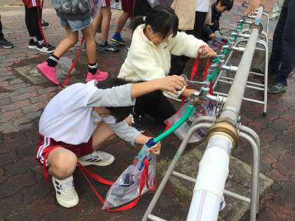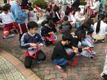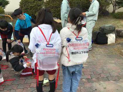 上下水道局主催の応急給水訓練に参加させてもらいました。花壇の奥にある応急給水栓から給水袋に補水する訓練を体験しました。