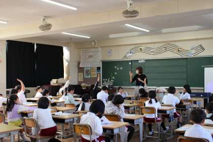 音楽の時間には、リズム作りをしました。体育の時間には、リレー遊びをしました。