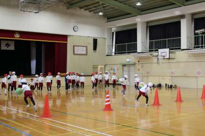 体育の時間には、ボール投げをしたり、ラダーゲームをしたりしました。