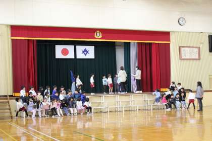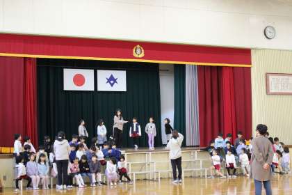 学習発表会に向けて、体育館の舞台で練習しました。場面の移り変わりの移動の仕方を確認しました。