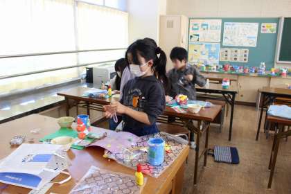 国語の時間には、自分の好きな時間についてのスピーチ原稿を考えました。図工の時間には、空き容器にカラフルな紙粘土や思い思いの飾りをつけて、ペン立てを作成しました。