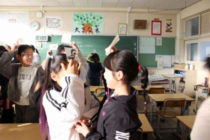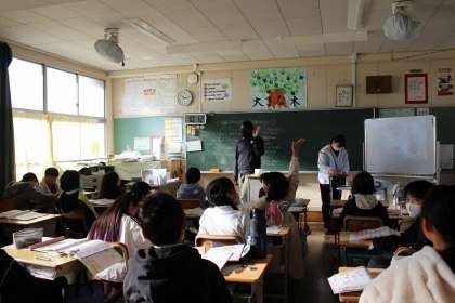 わかまるタイムには、ヒントを出し合いながら動物仲間集めゲームをしました。外国語の時間には、飲み物やデザートの言い方を練習しました。図工の時間には、版画を彫り進めました。