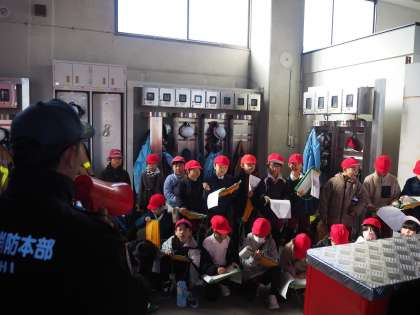 南消防署見学に出かけました。消防署の施設を案内していただいたり、消防車のつくりや消防服について教えていただいたりしました。訓練している様子も見せていただきました。