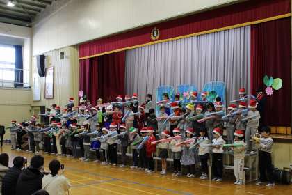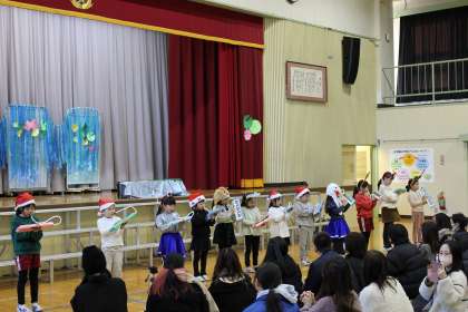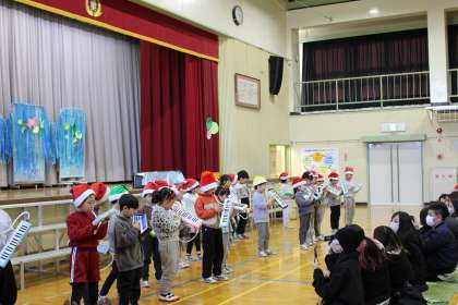 第2部では、クリスマスコンサートを行いました。鍵盤ハーモニカで「きらきらぼし」や「ジングルベル」を」演奏したり、「勇気100パーセント」を歌ったりしました。