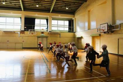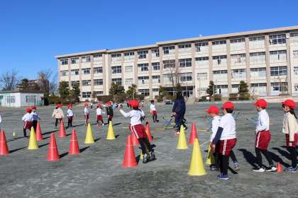 体育の時間には、的あてやペアでスキップ競走、ゴム跳びなどをしました。