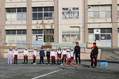 トヨタ自動車の野球選手が、投げ方教室を開いてくれました。投げ方のコツを教えてもらい、Tボールをしました。
