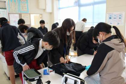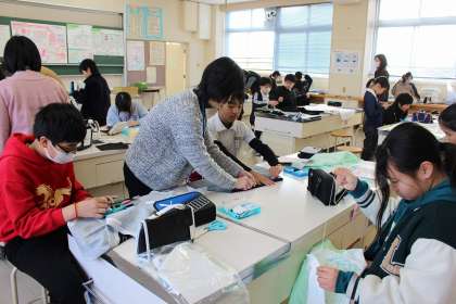 家庭科ボランティアの方に支援していただきながら、エプロンのわき、胸、裾の部分を仮縫いしました。