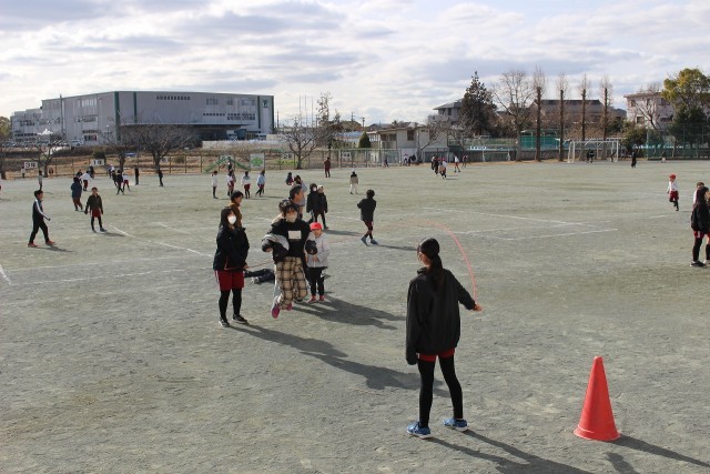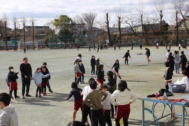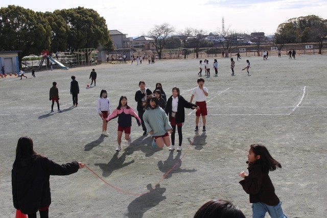 いきいきタイムに、体育委員会が大繩を回し、8の字跳びや大波小波にチャレンジしています。2月5日まで学年ごとに行います。