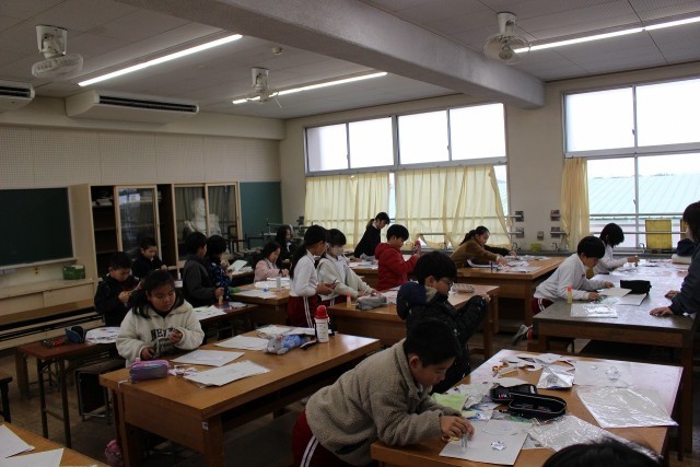 体育の時間には、リレーをしました。チームのタイムによって走る距離を工夫しながらリレーを楽しみました。図工の時間には、好きな動物をテーマに紙版画づくりを進めました。