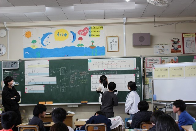 図工の時間には、木版画のやり方や注意点などを確認し、彫り始めました。算数の時間には、分母の違う分数の大きさ比べをしました。