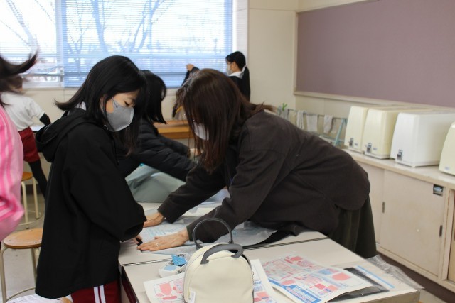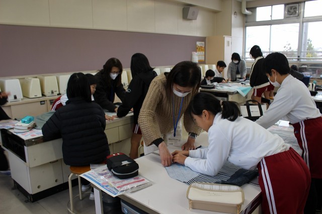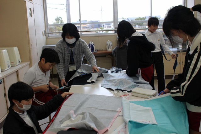 家庭科の時間には、ボランティアの方に支援していただきながら、エプロンの布を裁ち、仮縫いをしました。