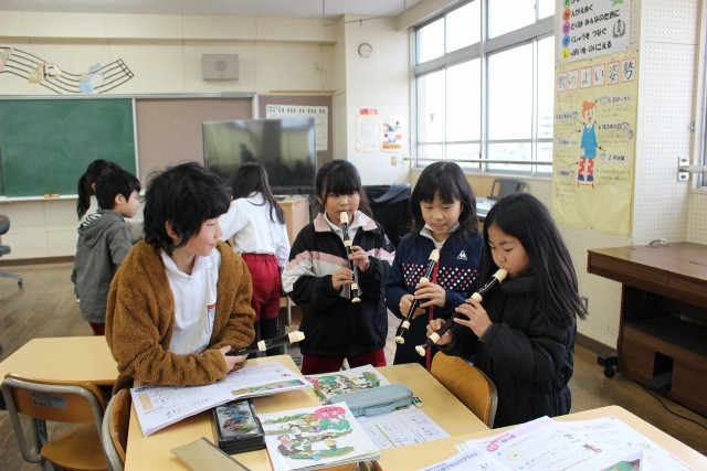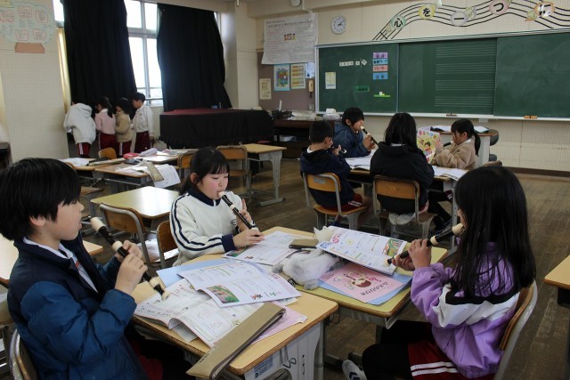 音楽の時間には、ラドレの3つの音で旋律づくりをして、グループで演奏しました。