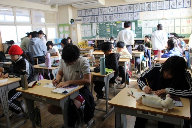 総合の時間には、お世話になった地域の方にお礼の手紙を書きました。理科の時間には、大気汚染や水質汚染などを防止するために、社会全体で取り組めることや自分にできることを考えました。