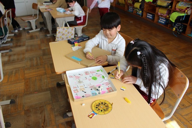 図工の時間には、お話すごろくづくりをしました。道徳の時間には、一生懸命に時間いっぱいそうじをすることのよさについて考えました。