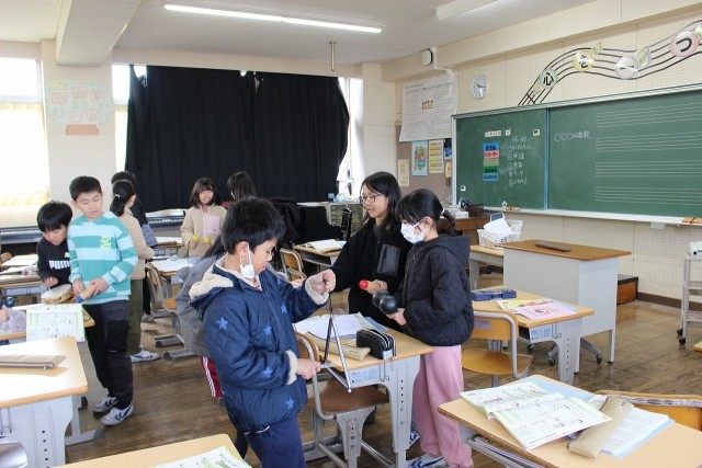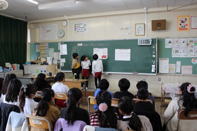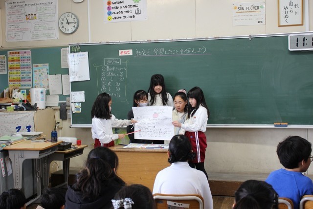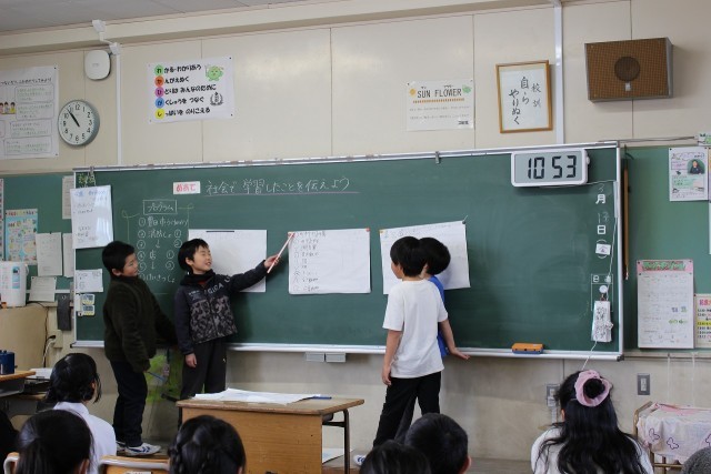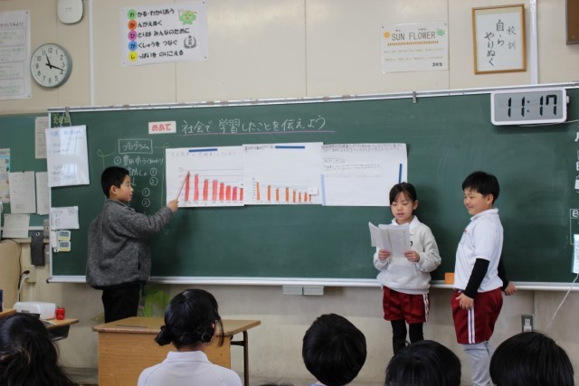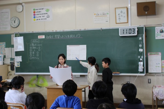 外国語活動の時間には、数字ビンゴをしました。音楽の時間には、打楽器を使ってグループでリズム作りをしました。社会科の時間には、今まで学習したことをもとに、グループごとにテーマを決めてまとめ、発表しました。