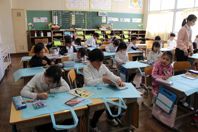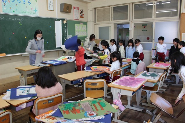 体育の時間には、学年合同でドッジボールをしました。図工の時間には、作品バックに絵を思い出の絵を描きました。国語の時間には、給食の夢のメニューを考え、説明文を作りました。
