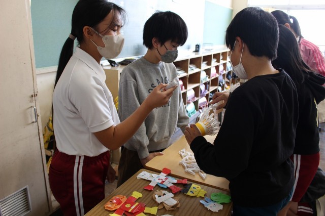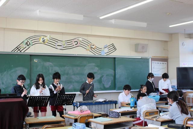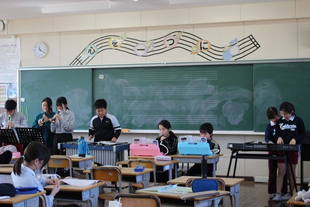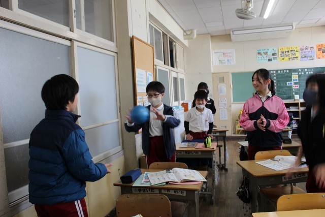 音楽の時間には、グループごとに「威風堂々」の合奏を発表しました。外国語科の時間には、好きなものを伝えるボール送りゲームをしました。学活では、お楽しみ会をしました。