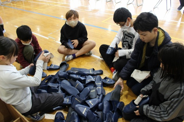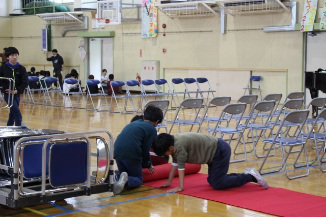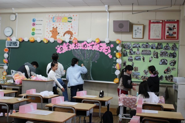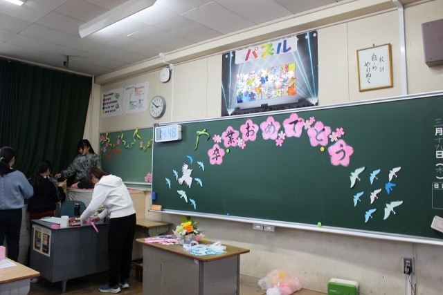5年生が、卒業式の会場づくりや6年生の教室の飾りつけ、階段やトイレの掃除をしました。明日の卒業式に向けて、6年生のために一生懸命に準備を進めました。