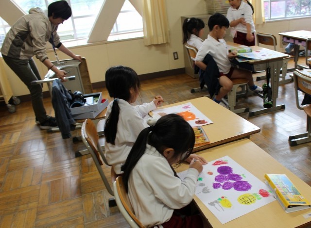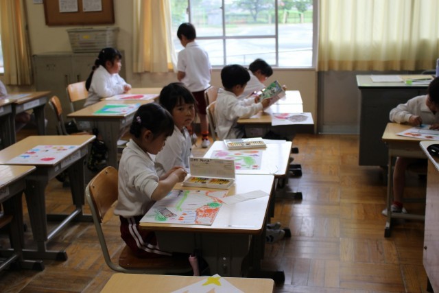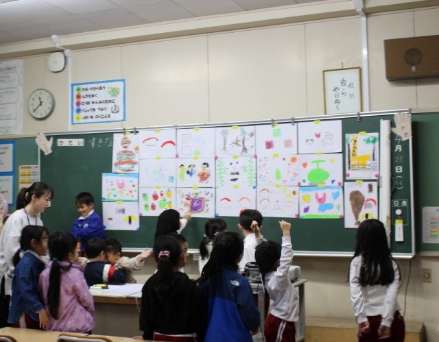 図工の時間には、クレヨンを使って自分の好きなものの絵を描きました。描いた絵をみんなに紹介しあいました。