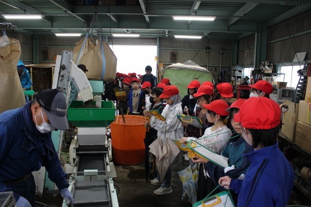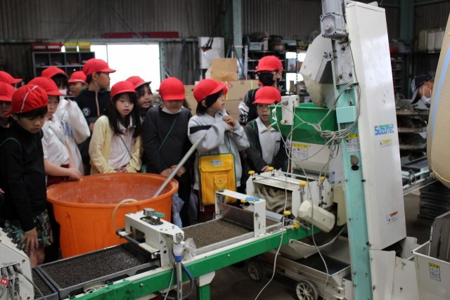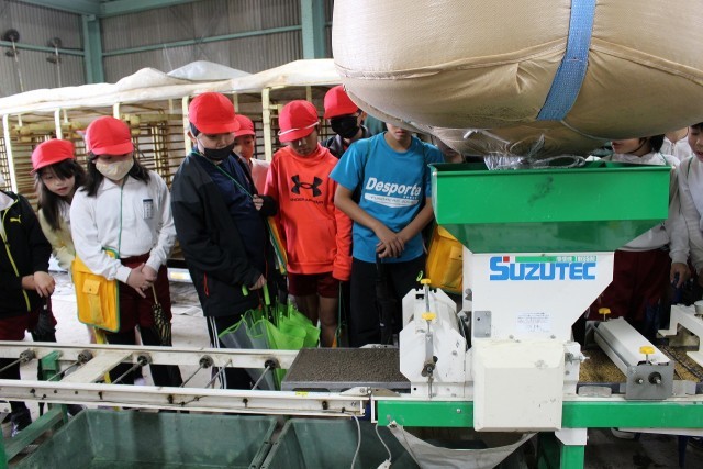 総合の時間には、種まきの様子を見せていただきました。もみがまかれていく工程や1シートでどのくらいの米が収穫できるかなど、教えていただきました。