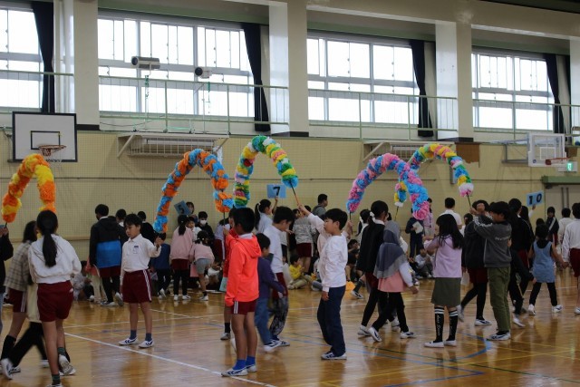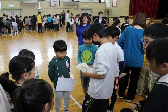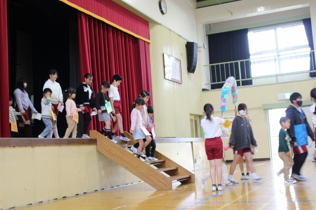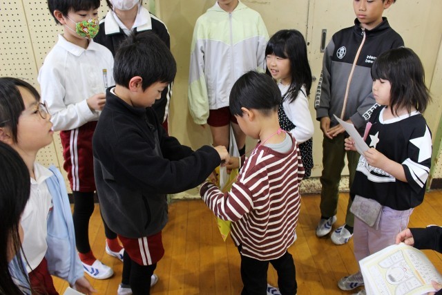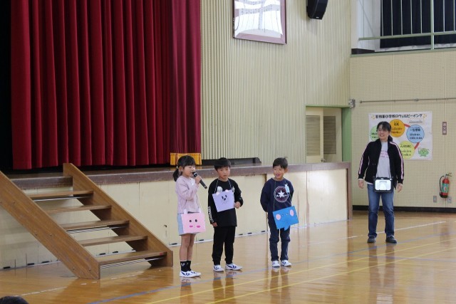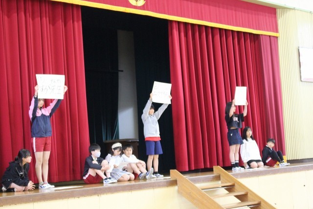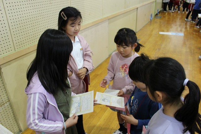 新入生を迎える会を行いました。ファミリー班の6年生と手をつないで入場し、班ごとに自己紹介をしました。2~6年生は、自己紹介カードを1年生にプレゼントしました。企画委員の学校クイズでは、全校で盛り上がりました。みんなで仲良く楽しく活動することができました。