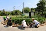 OB会の皆さんが、子どもたちのよりよい環境づくりのために、花壇づくりや草取りをし...