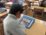 図画工作科で紙版画をしました。タブレットで自分の作品を撮影し、がんばったことを書...