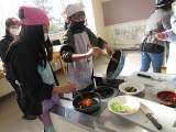 家庭科で調理実習をしました。一人一調理で野菜炒めを作りました。