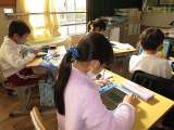 図画工作科で、「すいかぼうず」のお話の絵を描いています。