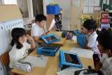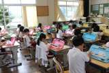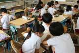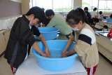 家庭科の学習で、手洗いの洗濯実習を行いました。自分の赤白帽子の汚れをもみ洗いして...