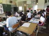 生活科でアサガオの花を使って色水あそびをしました。色水で紙を染めました。