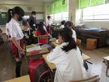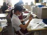 家庭科でナップザックを作っています。地域のボランティアの方にミシンぬいを見ていた...