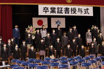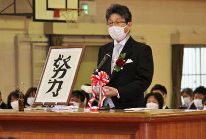 第44回 卒業式から 公開日 2022/03/26 更新日 2022/03/26 お知らせ 卒業式の中盤。「校長式辞」の声とともに、校長先生が演台に上がりました。手には、文字が書かれた額を持っています。先日行われた冬季オリンピックでのエピソードを交えて、6年生の卒業を祝いました。 卒業生からは、「別れのことば」とともに、「別れの歌」が届けられました。一人一人が次の空へと飛び立つ今日にふさわしい、力強さと切なさが一体になったものでした。