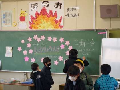 3月24日、修了式の教室。1年生から5年生は、それぞれの「学年を卒業する」日です。教室へ行くと、担任の先生からのメッセージが黒板に!